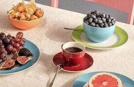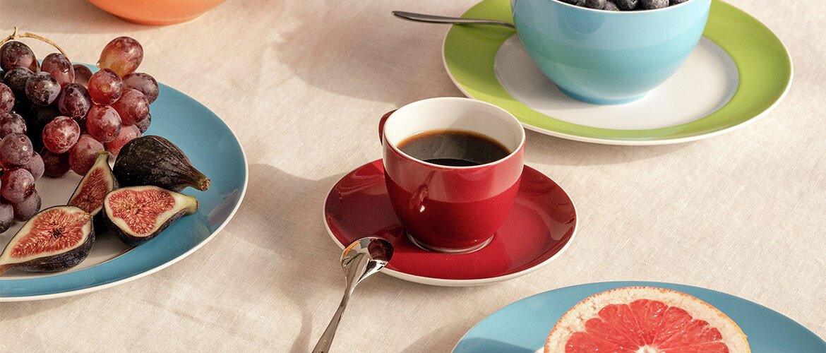 Als Statement: Setzen Sie die Fuchsia-Serie von Sunny Day lediglich in Form von Einzelstücken ein. Decken Sie Ihren Tisch in schlicht, etwa mit der Serie Sunny Day Weiß, und brechen Sie die Tafel mit roten Farbtupfern in Form von einzelnen Tellern, Tassen oder Schalen der Serie Sunny Day Fuchsia auf.