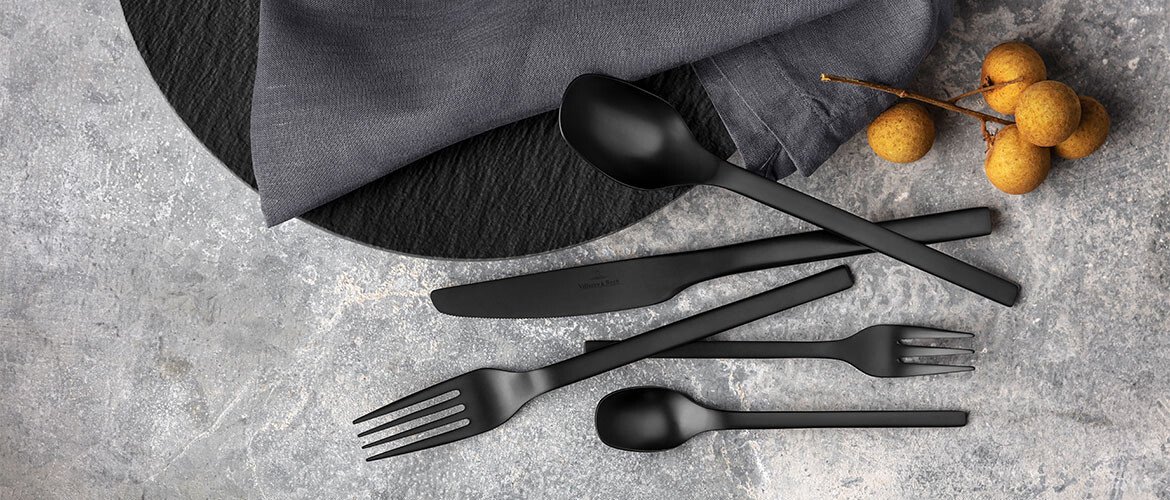 Dunkle Schönheit auf Ihrem Tisch: In ungewöhnlichem Schwarz-Look glänzt das Besteck aus Edelstahl elegant und jenseits gewohnter Optik mit dem übrigen Gedeck um die Wette. Gönnen Sie sich das gewisse Design-Extra und überraschen Sie Ihre Gäste. Ideal kombinieren Sie Manufacture Rock Besteck Ton in Ton oder schaffen faszinierende Gegensätze zu strahlend weißem, matten Geschirr wie Manufacture Rock blanc von Villeroy & Boch.